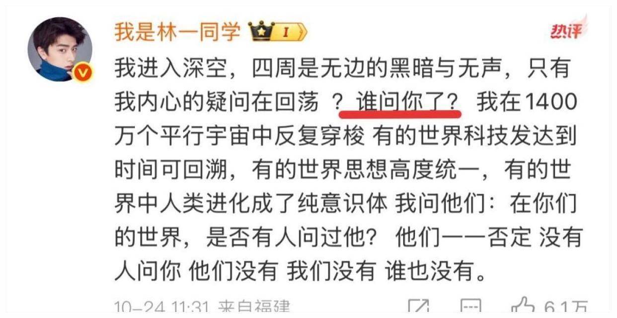 这条动态瞬间引爆热搜,但真正让吃瓜群众疯狂的 是林一在评论区那句神回复:“谁问你了?”。短短四字,像极了被冷落的老友 又像暗戳戳吃醋的前任,网友直呼:“三个人的电影 我却始终不能有姓名?”